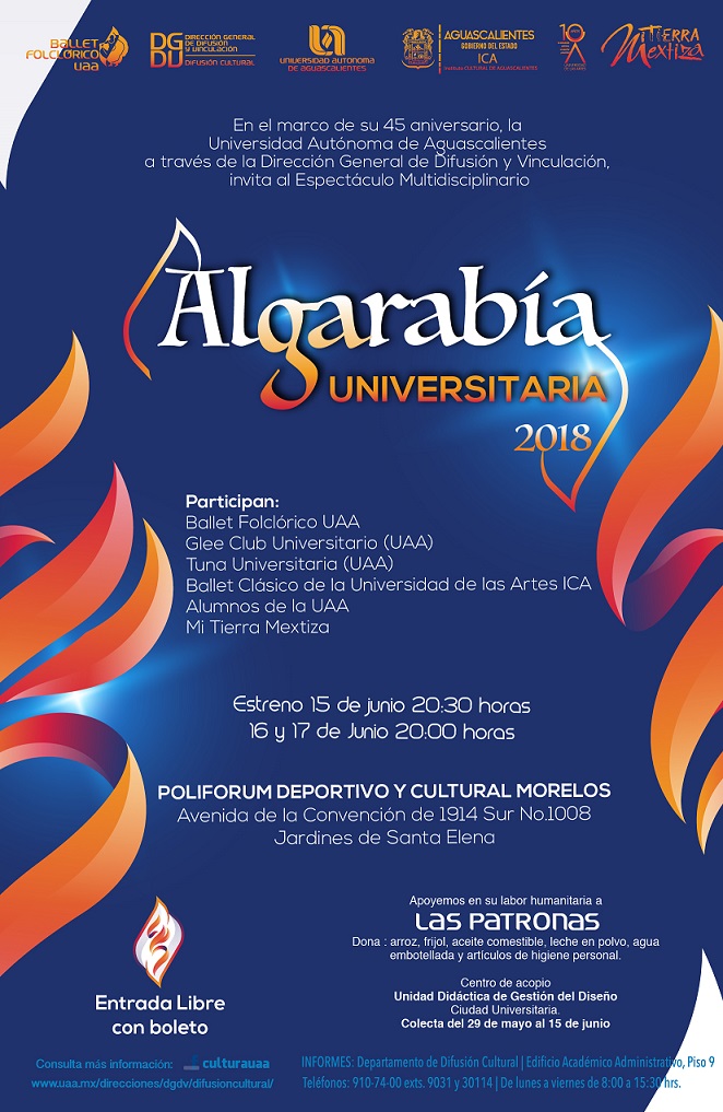 La Universidad Autónoma de Aguascalientes (UAA) presentará del 15 al 17 de junio el espectáculo multidisciplinario Algarabía Universitaria 2018 en el Polifórum Deportivo y Cultural Morelos, evento musical y dancístico desarrollado como parte de las celebraciones por el 45 aniversario de la Institución.