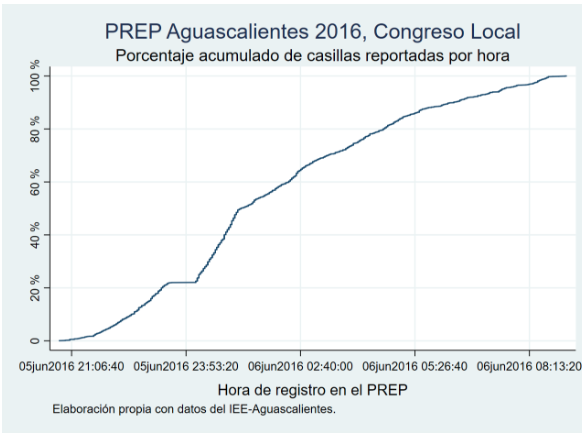 5. Con base en el proceso 2016 (me refiero a la elección de diputados locales), se puede esperar que un reporte de 80% de las casillas del PREP sucederá después del 6:00 AM del 2 de julio. En 2016, a las 5:26 AM del día siguiente a la elección, se habían contabilizado arriba del 80% de las casillas. El grado de avance puede observarse en la gráfica adjunta, que presenta el porcentaje de casillas computadas en el eje vertical y la hora de registro en el PREP en el eje horizontal.