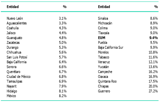 Por entidad federativa, el porcentaje de personas en rezago educativo oscila entre un 20.6% en Ciudad de México y 49.7% en Oaxaca. Aguascalientes, entre los mejores, presenta un 26.2%. Se sabe, que las personas en rezago educativo no cuentan con la escolaridad secundaria.