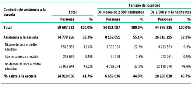 De las personas que indicaron asistir a la escuela y disponen de una beca o crédito educativo son 7.5 millones de personas, es decir el 12.6 por ciento.