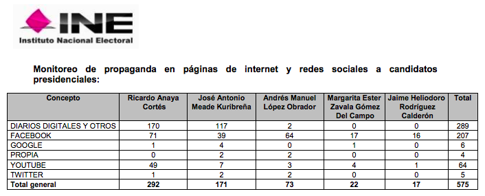 La unidad técnica de fiscalización del INE publicó que, hasta el 25 de mayo, los candidatos presidenciales habrían pagado por difundir 575 “anuncios” en páginas de internet y redes sociales: 292 de Ricardo Anaya, 171 de José Antonio Meade, 73 de López Obrador, 22 de Margarita Zavala -quien ya renunció a la candidatura- y 17 de Jaime Rodríguez Calderón.