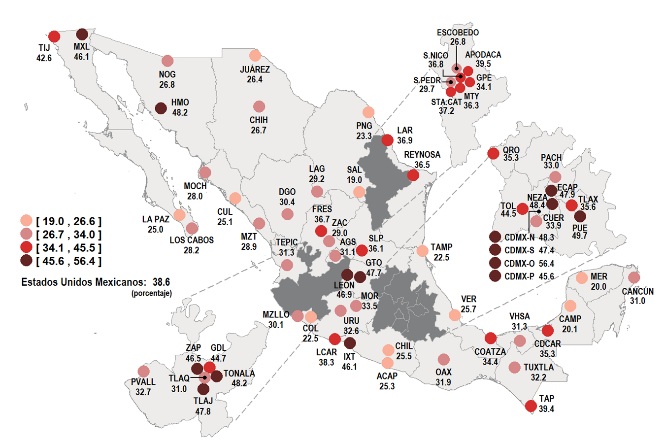 En el ámbito nacional, en 38.6% de los hogares en áreas urbanas, al menos uno de sus miembros fue víctima de los delitos de robo y/o extorsión. Esta cifra se incrementa en la Región Oriente de la Ciudad de México y en la ciudad de Puebla, al llegar a 56.4% y 49.7%, respectivamente. Mientras que en Saltillo y Mérida, la proporción de hogares con víctimas de robo y/o extorsión es de 19% y 20%, respectivamente.