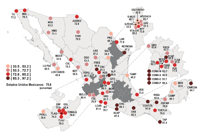 El porcentaje de la población de 18 años y más que consideró al gobierno de su ciudad como “muy o algo efectivo” para resolver los problemas más importantes fue 22.5% a nivel nacional. Las ciudades con mayor porcentaje en dicha percepción fueron: Reynosa (57.2%), Manzanillo (45.8%) y Mérida (45.7%). Mientras que las ciudades con menor porcentaje de percepción de efectividad para resolver problemas fueron: Cancún (6.7%), Tijuana (7.3%) y Tuxtla Gutiérrez (7.5%).