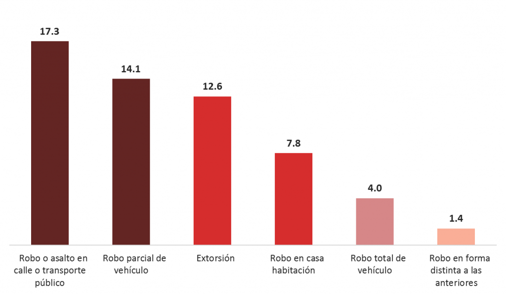 Durante el primer semestre de 2018, en 17.3% de los hogares de las ciudades de interés, al menos un integrante del hogar sufrió Robo o asalto en la calle o en el transporte público. Por otra parte, 14.1% de los hogares fue víctima de robo parcial de vehículo, y en 12.6% de los hogares al menos un integrante del hogar sufrió Extorsión.