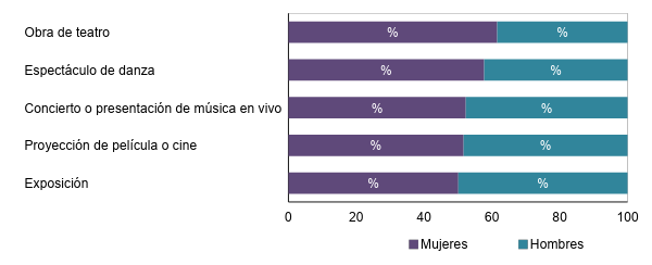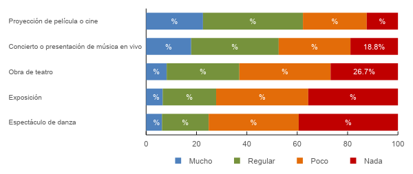 De la población de 18 y más años que declaró haber asistido a algún evento cultural en los últimos doce meses, la asistencia por tipo de evento es ampliamente desigual, el 86.2% dijo que asistió al menos una vez a una proyección de películas o cine, la participación se reduce a un 49% para concierto o presentación de música en vivo, el 25.6% asistió a obra de teatro, porcentaje muy similar para exposición (25.5%) y la menor proporción se registra para la asistencia a un espectáculo de danza.
