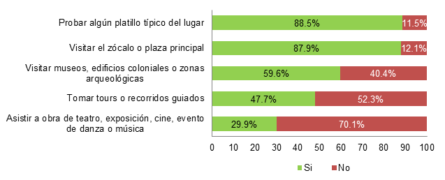 Sobre las actividades culturales que realiza la población de 18 y más años de edad al visitar otra localidad, se declaró que realizan con mayor frecuencia: Probar algún platillo típico del lugar y Visitar el zócalo o plaza principal y, 88.5% y 87.9%, respectivamente.