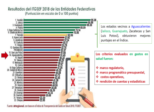 En el caso específico de la transparencia en el sector salud, de los 32 estados del país el 73 por ciento reprobaron en el índice de Transparencia del Gasto en Salud (ITGSEF) 2018 de la consultora @regional, que busca saber cuánto y en qué se gasta el dinero que va destinado en este sector, gasto que representa el 2.43 por ciento del Producto Interno Bruto del país y que lo coloca como el segundo más importante, después del de educación.