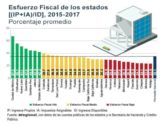 Adicionalmente, a la asociación @regional le interesa dar a conocer el esfuerzo fiscal que están haciendo las entidades federativas para afrontar sus compromisos, sumando los ingresos propios y los impuestos asignables a los ingresos disponibles. A nivel nacional el esfuerzo fiscal se calcula en promedio en un 35.1%.