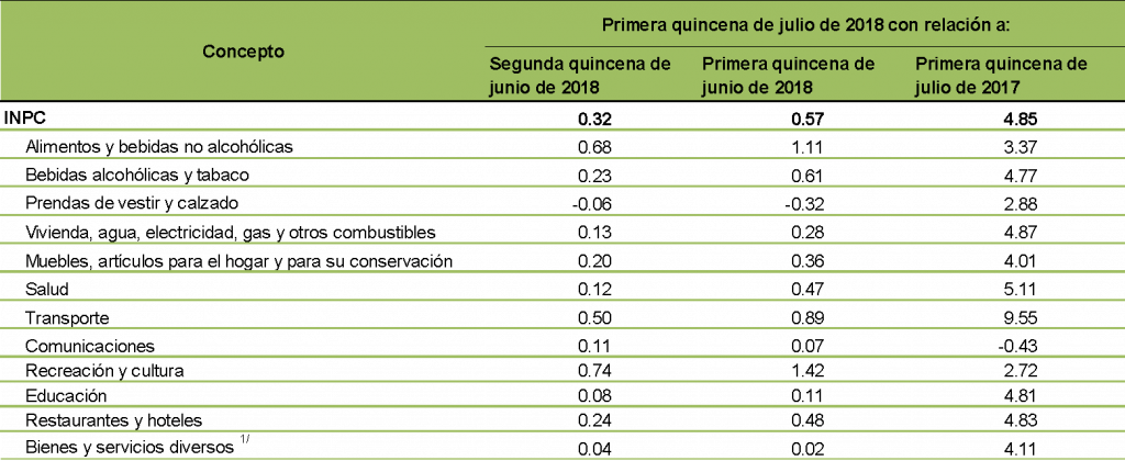 En la primera quincena de julio de 2018 el Índice Nacional de Precios al Consumidor (INPC) aumentó 0.32 por ciento quincenal. En el mismo periodo del año anterior se incrementó 0.24 por ciento.