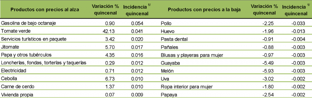 Los componentes del índice de precios no subyacente presentaron un alza quincenal: los precios de los productos agropecuarios subieron 1.11 por ciento y los de los energéticos y tarifas autorizadas por el gobierno lo hicieron en 0.48 por ciento.