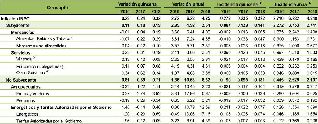 (1) La inflación subyacente se obtiene eliminando del cálculo del INPC los bienes y servicios cuyos precios son más volátiles, o bien que su proceso de determinación no responde a condiciones de mercado. Así, los grupos que se excluyen en el indicador subyacente son los siguientes: agropecuarios y, energéticos y tarifas autorizadas por distintos órdenes de gobierno.