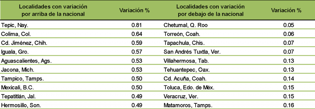 En el siguiente cuadro se muestran las principales localidades con la mayor variación, por arriba o por debajo de la registrada en el INPC, en la quincena que se reporta.