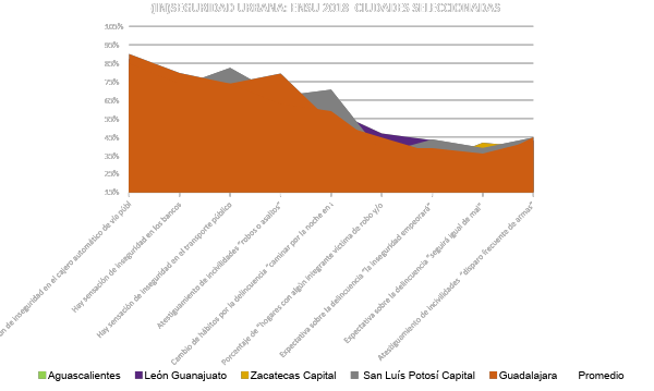 Entre el vecindario regional de ciudades, Aguascalientes cuenta con los niveles menos altos de percepción o atestiguamiento de inseguridad. Para este análisis fueron seleccionadas cinco ciudades: las ciudades vecinas de León y Guadalajara, así como las capitales de los estados de San Luís Potosí y Zacatecas, que en la mayoría de los casos presentan picos muy superiores a los de Aguascalientes.