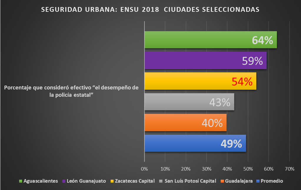 La incidencia de percepción de inseguridad y de hechos delictivos, es mayor en las ciudades del vecindario regional que en Aguascalientes, por lo que los ciudadanos calificaron como 15 y 17% más efectivo el desempeño de las policías hidrocálidas tanto estatal como municipal que el de sus pares.
