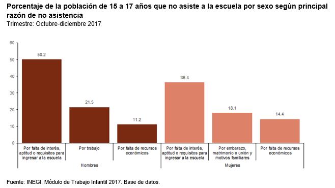 Las causas por las que la población no asiste a la escuela son complejas y multifactoriales. La información obtenida del Módulo de Trabajo Infantil 2017, indica que la principal razón por la que los niños de 12 a 14 años abandonan la escuela es por falta de interés, aptitud o requisitos para ingresar a la escuela (48.3%) y por la falta de recursos económicos (14.2 por ciento).