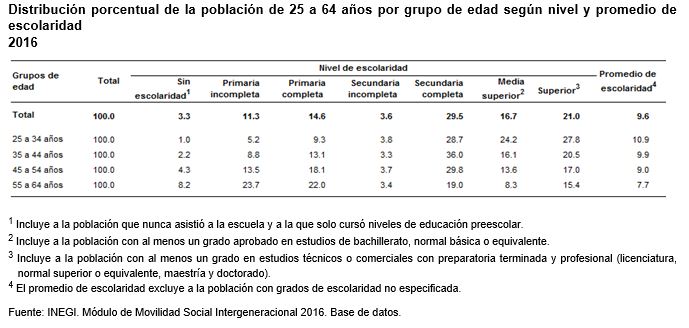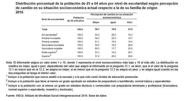 Un aspecto fundamental de la movilidad social es la educación, por lo que resulta importante conocer la movilidad educativa que se ha dado en la población a nivel generacional. En el Módulo de Movilidad Social Intergeneracional 2016, se compara el nivel de instrucción de la población de 25 a 64 años, respecto al proveedor principal, el cual puede ser su padre, madre, ambos, o cualquier otro familiar o persona.