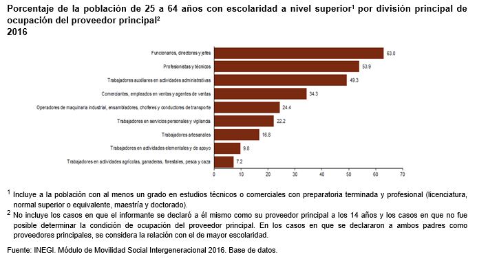 La ocupación del proveedor principal juega un papel primordial en la educación intergeneracional. En este sentido, se observa que 63% de la población de 25 a 64 años cuyo proveedor laboraba como funcionario, director o jefe, declararon tener una instrucción de nivel superior; en contraste, 7.2% cuentan con este nivel educativo y tuvieron como proveedor principal a una persona que se ocupaba en actividades agropecuarias.