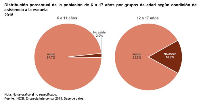En el país, a partir de los datos que proporciona la Encuesta Intercensal 2015, 98 de cada 100 niños de 6 a 11 años asisten a la escuela (97.7%), en tanto que dos de cada 100 niños de este grupo (263 041), no van a la escuela. Las entidades federativas que muestran el mayor porcentaje de inasistencia escolar en este grupo de edad son Chiapas (4.2%), Campeche (2.7%), Michoacán y Colima (cada una con 2.6 por ciento).