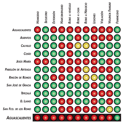 Con base en estos datos, el Semáforo Delictivo encendió su alerta máxima en Aguascalientes para los delitos de homicidio, secuestro, extorsión, lesiones, narcomenudeo, violaciones sexuales, lesiones, violencia familiar, así como robo a casa, a negocio y a vehículos; es decir, diez de los once delitos evaluados mensualmente por la organización.