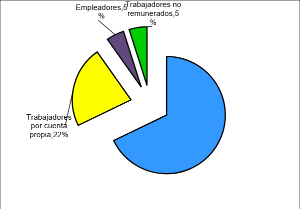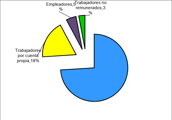 La población ocupada alcanzó 96.5% de la PEA durante julio de 2018. Del total de ocupados, el 67.8% opera como trabajador subordinado y remunerado ocupando una plaza o puesto de trabajo, 22.4% trabaja de manera independiente o por su cuenta sin contratar empleados, 4.9% se desempeña en los negocios o en las parcelas familiares, contribuyendo de manera directa a los procesos productivos pero sin un acuerdo de remuneración monetaria, y finalmente un 4.9% son patrones o empleadores.