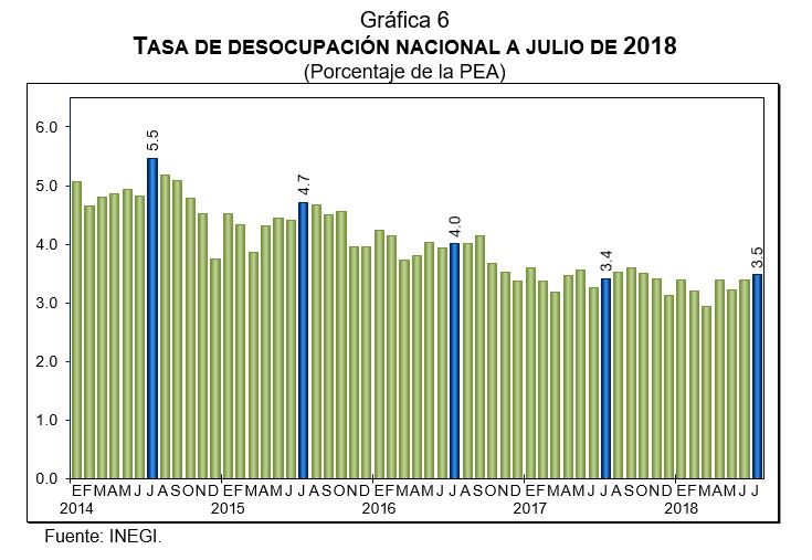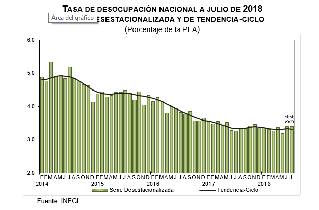 La Tasa de Desocupación (TD), que se refiere al porcentaje de la Población Económicamente Activa (PEA) que no trabajó siquiera una hora durante la semana de referencia de la encuesta pero manifestó su disposición para hacerlo e hizo alguna actividad por obtener empleo, fue de 3.4% de la PEA en el ámbito nacional, mismo porcentaje que el del mes precedente. En su comparación anual, la TD subió en julio de 2018 frente a la de igual mes de 2017 (3.4% vs 3.3), con datos ajustados por estacionalidad.