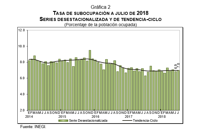 La Tasa de Subocupación (referida al porcentaje de la población ocupada que tiene la necesidad y disponibilidad de ofertar más tiempo de trabajo de lo que su ocupación actual le demanda) representó el 7.0 por ciento. En su comparación anual, esta tasa fue superior a la del mismo mes de 2017 que cerró en 6.3 por ciento.