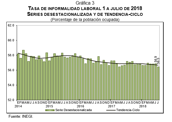 La Tasa de Informalidad Laboral 1 (proporción de la población ocupada que es laboralmente vulnerable por la naturaleza de la unidad económica para la que trabaja, con aquellos cuyo vínculo o dependencia laboral no es reconocido por su fuente de trabajo) fue de 56.5% en el séptimo mes de 2018, cifra menor a la reportada en junio pasado, e inferior en (-)0.7 puntos respecto a la de julio de 2017.