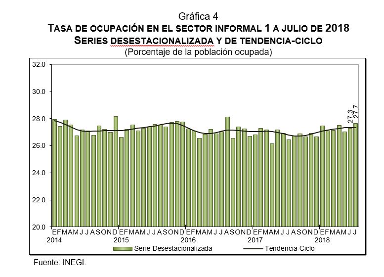 Asimismo, la Tasa de Ocupación en el Sector Informal 1 (que se refiere a la proporción de la población ocupada en unidades económicas no agropecuarias operadas sin registros contables y que funcionan a partir de los recursos del hogar o de la persona que encabeza la actividad sin que se constituya como empresa), representó el 27.7% en julio del año en curso, dato superior al observado en el mes previo que fue de 27.3%, y mayor en 1.2 puntos frente al de igual mes del año pasado.