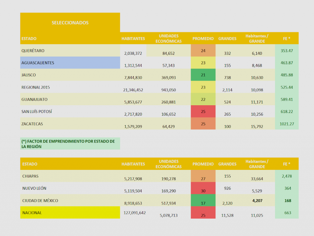 Analizando a Aguascalientes y la región cercana tenemos, que Querétaro y Aguascalientes destacan por tener menores resistencias al emprendimiento y la inversión que San Luis y Zacatecas; los potosinos, por tener un alto número de habitantes por Unidad Económica y los zacatecanos por contar con pocas unidades económicas importantes generadoras de empleos. En general, la región de estados vecinos, presenta un Factor con mejores condiciones que el resto del país.