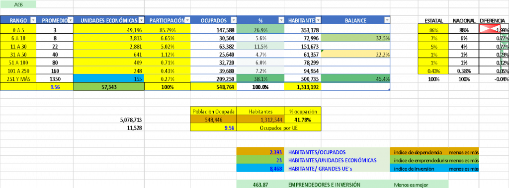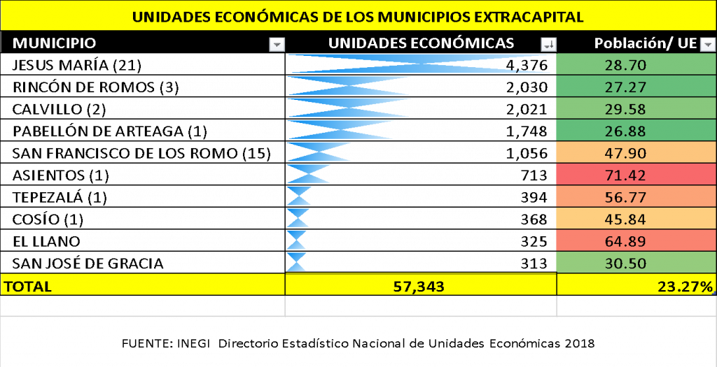 En el caso de Aguascalientes, para el municipio de la capital la proporción por unidad económica es de 21 habitantes / UE, con 44, 000 en total. Por otro lado, son 13,344 las empresas y negocios asentados en el espacio extra capital donde se asienta la tercera parte de la población. Los municipios del interior participan con una de cada cuatro unidades económicas.