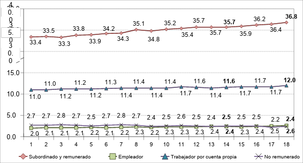 De las anteriores categorías se desprende que los trabajadores subordinados y remunerados se incrementaron en 1.1 millones de personas entre el segundo trimestre de 2017 e igual periodo de 2018, los trabajadores por cuenta propia en 387 mil personas y los empleadores en 166 mil personas, en tanto que los ocupados que no perciben una remuneración por su trabajo descendieron en (-)110 mil personas, en el lapso en cuestión.