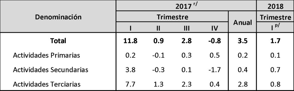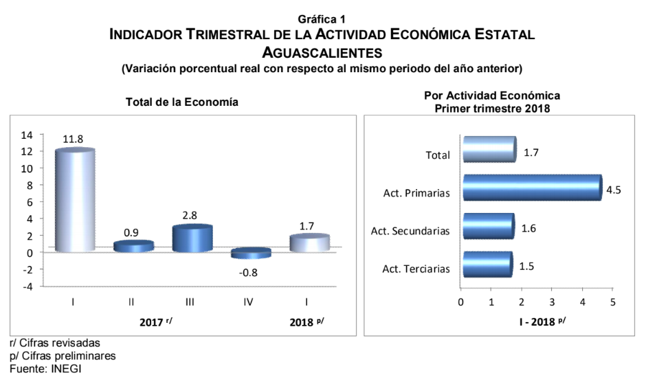 Aguascalientes mostró un incremento anual de 1.7% durante el primer trimestre de 2018, motivado por el comportamiento de las Actividades Primarias, Secundarias y Terciarias que aumentaron 4.5, 1.6 y 1.5%, respectivamente.