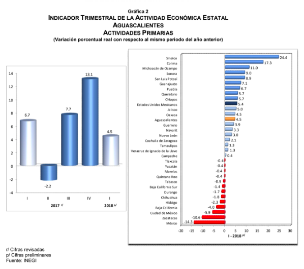 En el primer trimestre de 2018, Aguascalientes obtuvo la posición 16, en el total de la economía, con respecto a las 32 entidades federativas; asimismo, aportó 0.02 puntos porcentuales al crecimiento nacional, ubicándose en el lugar 17 de contribución.