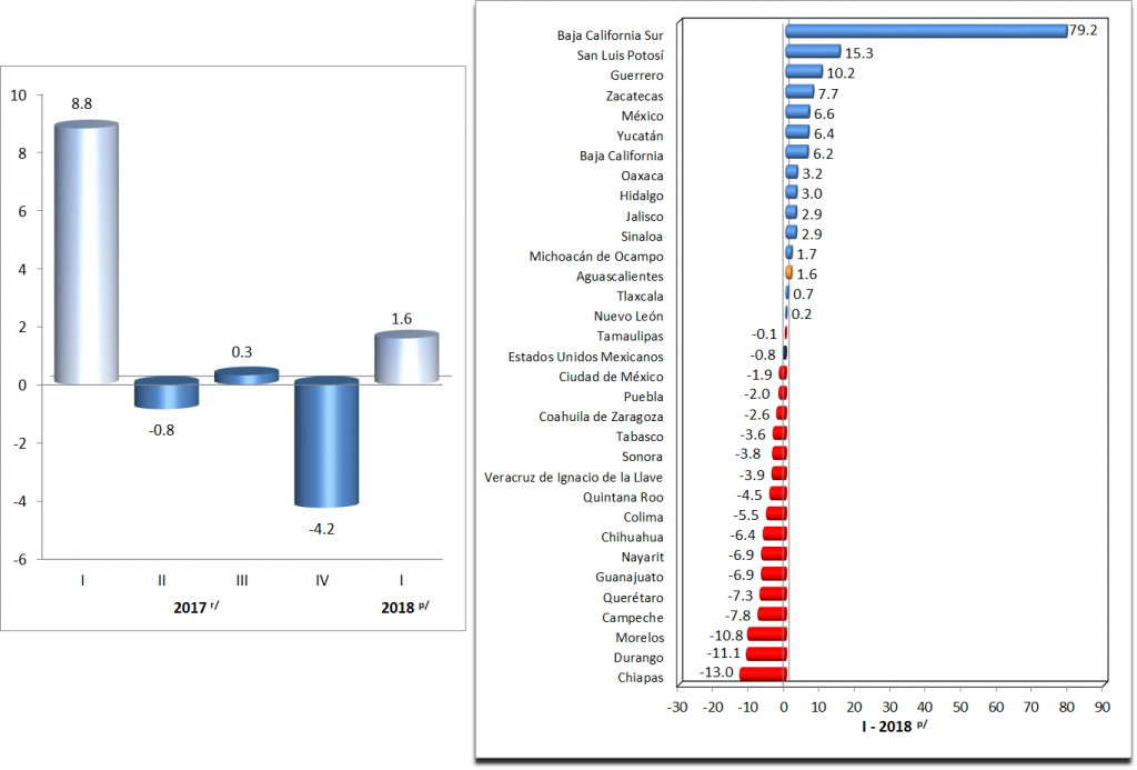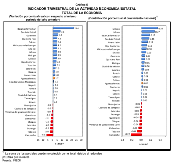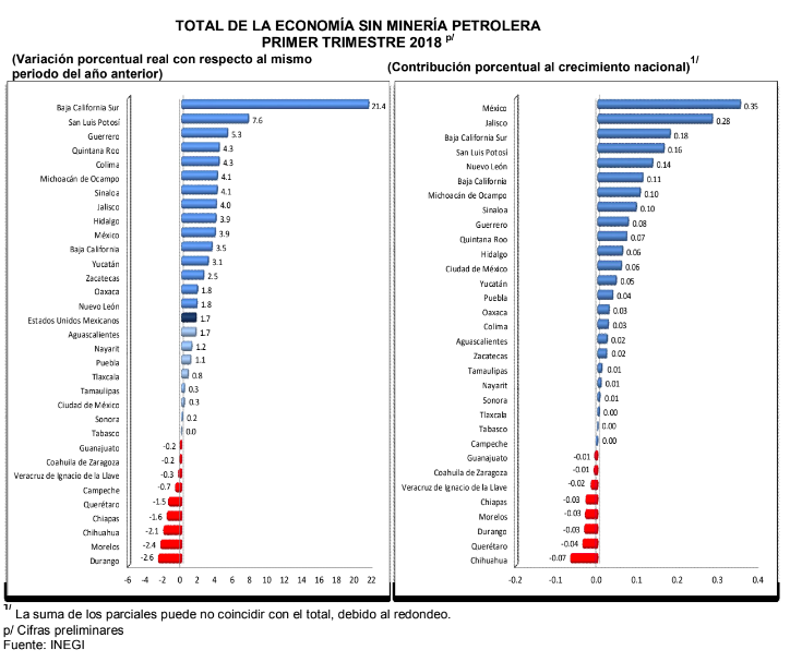 En el primer trimestre de 2018 la variación anual nacional del Total de la Economía alcanzó una evolución de 1.7%, quedando 15 entidades por arriba de la media nacional. Siendo México y Jalisco, las entidades que más aportaron al crecimiento nacional.