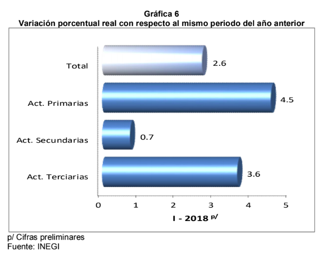 Las Actividades Primarias que incluyen la agricultura, cría y explotación de animales, aprovechamiento forestal, pesca y caza, reportaron un incremento a tasa anual en el primer trimestre de 2018 de 4.5%, motivado por el comportamiento de la cría y explotación de animales, principalmente. Debido a esto, la entidad se ubicó en el lugar 12 a nivel nacional.