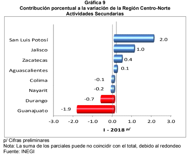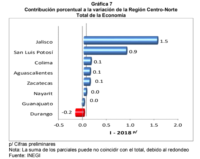 Tampoco en el análisis regional Aguascalientes tiene un lugar destacado, la Región Centro-Norte del país (Aguascalientes, Colima, Durango, Guanajuato, Jalisco, Nayarit, San Luis Potosí y Zacatecas), aportó el 17.8% al total de la economía y contribuyó con 0.5 puntos porcentuales al crecimiento nacional, en el primer trimestre de 2018; y de las entidades que integran esa región, las que más favorecieron al crecimiento del total de la economía fueron Jalisco y San Luis Potosí.