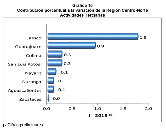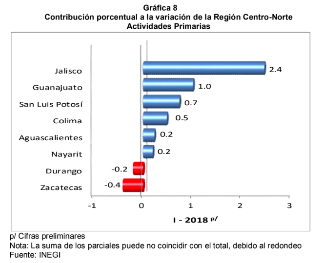 Aguascalientes, Colima, Durango, Guanajuato, Jalisco, Nayarit, San Luis Potosí y Zacatecas conforman la Región Centro-Norte del País, la cual aportó el 17.8% al total de la economía y contribuyó con 0.5 puntos porcentuales al crecimiento nacional, en el primer trimestre de 2018.