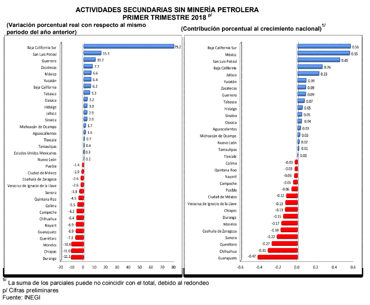 Respecto a las Actividades Secundarias, mostraron un crecimiento a tasa anual en el primer trimestre de 2018 de 0.3%, 17 entidades alcanzaron tasas positivas, mientras que las 15 restantes obtuvieron una caída en el periodo de estudio. Así, las entidades que más influyeron en la variación del crecimiento nacional fueron Baja California Sur, México, San Luis Potosí, Baja California y Jalisco, principalmente.