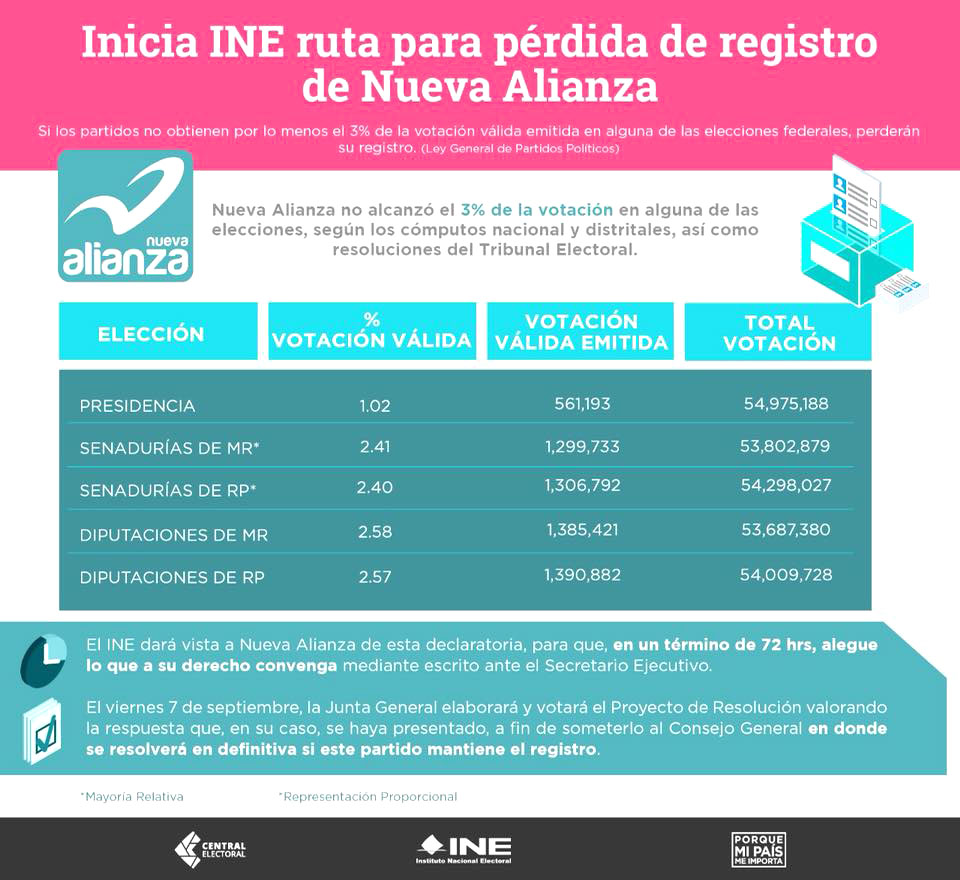 En ninguna de las elecciones: Presidente de la República, diputados de mayoría relativa, diputados de representación proporcional, senadores de mayoría relativa, senadores de representación proporcional, el Partido Encuentro Social y el Partido Nueva Alianza en alcanzaron el tres por ciento de la votación y, por lo tanto, se activa el supuesto establecido en el artículo 44 y 48 de la Legipe, así como, el 94 de la Ley General de Partidos Políticos.