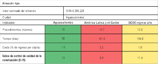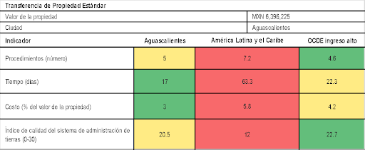 Para una empresa estándar, Aguascalientes se ubica mejor que todos los promedios de América Latina y el Caribe y superior en  9 de los 12 evaluados respecto los estándares de la OCDE de ingreso alto.