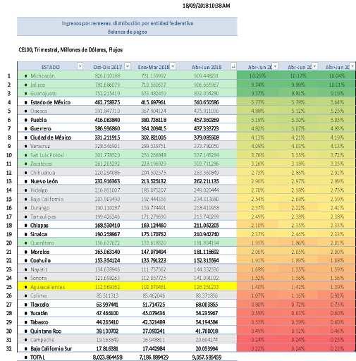 Fuente: BANXICO remesas por entidad al 1er semestre del 2018 y población 2015 INEGI