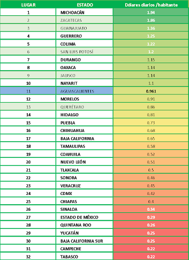 Los estados con mayor intensidad migratoria, reciben una mayor cantidad de dólares por habitante, en el caso de Michoacán, el más favorecido, recibe alrededor de 60 dólares mensuales por habitante; en Aguascalientes 30, y en Nuevo León 15 dólares. En Calvillo reciben 100.