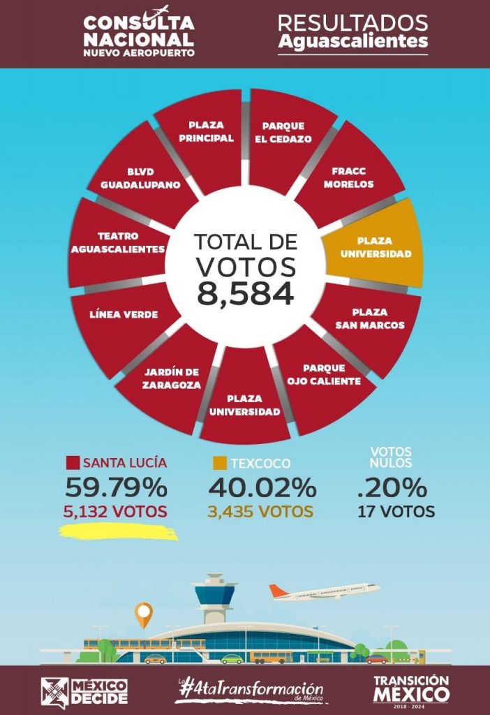 Desde las 9:00 de la mañana del 25 de octubre, hasta las 9:00 de la noche de este domingo estuvieron abiertas once casillas de votación en las que los ciudadanos de Aguascalientes pudieron votar sobre el futuro del proyecto para el NAICM.