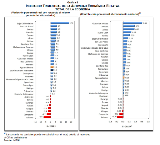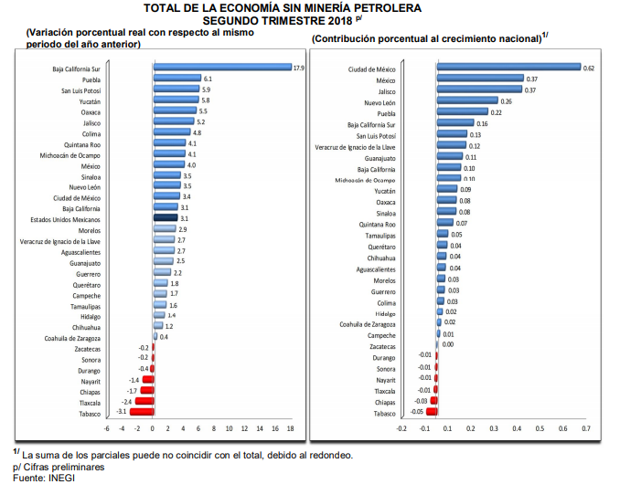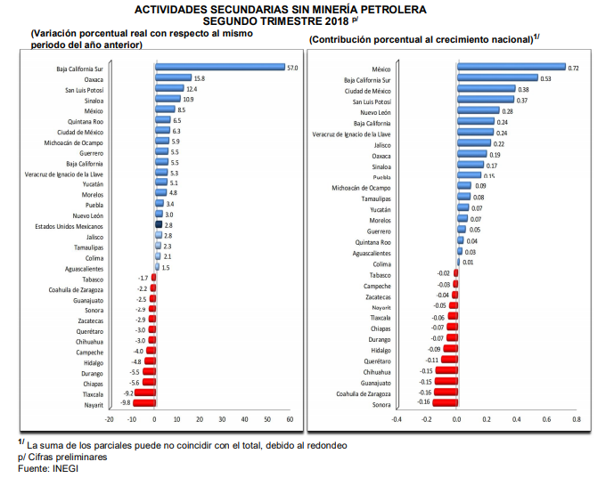 En apego a las necesidades de contar, en el corto plazo, con información del Total de la Economía y de las Actividades Secundarias, exceptuando la extracción de petróleo y gas, así como la perforación de pozos petroleros y de gas, se presenta el siguiente análisis económico sin considerar la minería petrolera. En este sentido, en el segundo trimestre de 2018 la variación anual nacional del Total de la Economía alcanzó una evolución de 3.1%, quedando 14 entidades por arriba de la media nacional. Siendo la Ciudad de México, México, Jalisco, Nuevo León y Puebla las entidades que más aportaron al crecimiento nacional.