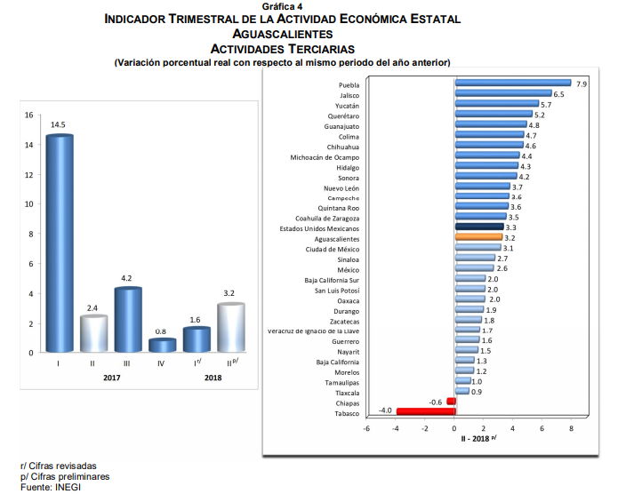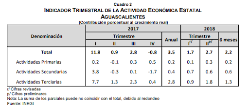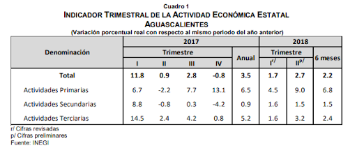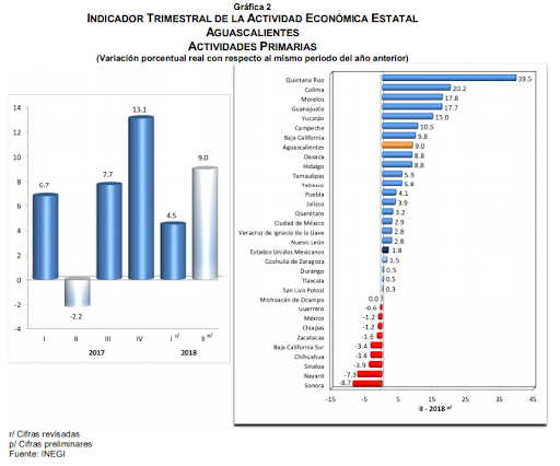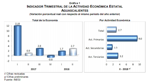 Aguascalientes mostró un incremento anual de 2.7% durante el segundo trimestre de 2018, motivado por el comportamiento positivo de las Actividades Primarias de 9%; seguido de las Actividades Secundarias de 1.5%; y de las Actividades Terciarias de 3.2 por ciento.