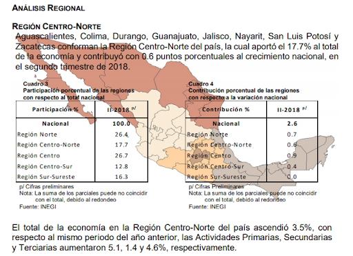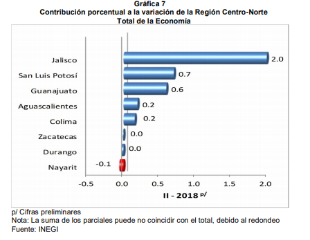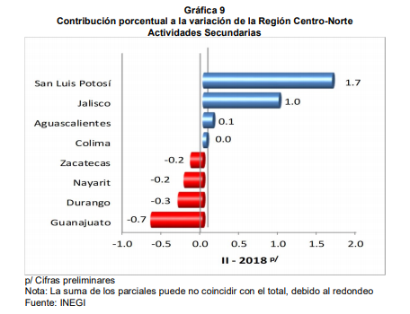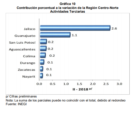Las entidades que más favorecieron al aumento del total de la economía, en el segundo trimestre de 2018, de la Región Centro-Norte fueron Jalisco, San Luis Potosí y Guanajuato.