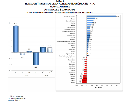 Por lo que respecta a las Actividades Secundarias mostraron un crecimiento a tasa anual en el segundo trimestre de 2018 de 2.8%, 19 entidades alcanzaron tasas positivas, mientras que las 13 restantes obtuvieron una caída en el periodo de estudio. Así, las entidades que más influyeron en la variación del crecimiento nacional fueron México, Baja California Sur, Ciudad de México y San Luis Potosí, principalmente.