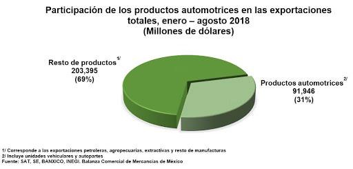 En el caso del comercio exterior, durante los primeros ocho meses de 2018 los productos provenientes de la industria automotriz terminal y de autopartes, aportaron 31 de cada 100 dólares que México exportó a otros países.
