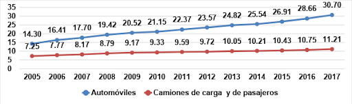 Evolución del parque vehicular, 2005-2017 ¹/ (Millones de unidades)