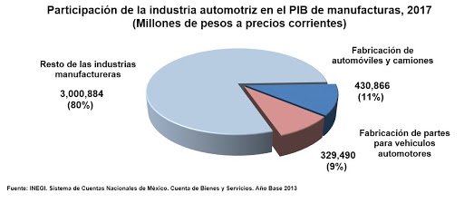 Destaca la producción de automóviles y camiones (ligeros y pesados) como la principal actividad de las manufacturas y que contribuyó en 2017 con la generación del 11% del Producto Interno Bruto (PIB).